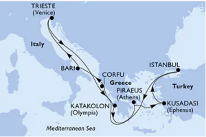 Imbarco sulla nave MSC CROCIERE e partenza dal porto di Bari alle ore 14:00.